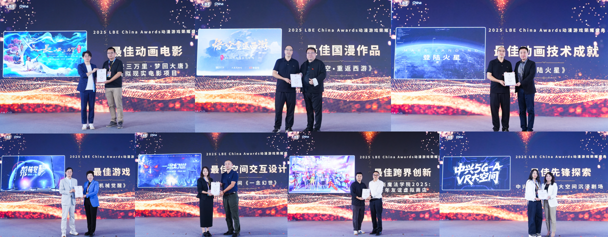 上午11时30分,大会迎来另一高潮——“2025 LBE China Awards动漫游戏荣耀盛典”正式启动。现场揭晓了包括最佳动画电影奖、最佳国漫作品奖、最佳游戏奖、最佳空间交互设计奖、最佳动画技术成就奖、最佳先锋探索奖、最佳跨界创新奖在内的七大奖项。获奖作品如《长安三万里•梦回大唐》《悟空•重返西游》《登陆火星》《一念幻世》《机械觉醒》《魔法学院》《中兴5G-A VR大空间》等,不仅在技术与内容上实现突破,更在商业模式与用户体验上树立了新标杆。展现出“动画+”跨界融合的广泛可能。
