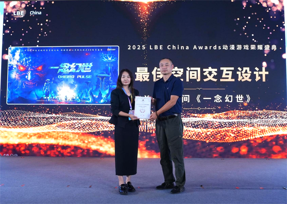 “2025 LBE China Awards年度最佳空间交互设计奖”授予了北京妙音数科股份有限公司的开创性作品——XR大空间《一念幻世》。该项目因其在交互方式上的革命性突破而备受赞誉,通过技术创新为用户与虚拟世界的互动建立了全新模式,重新定义了沉浸式体验的交互边界。